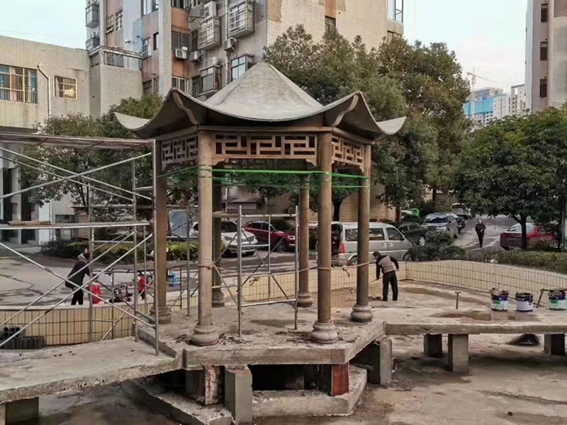 水泥仿古建筑-凉亭由钢筋混凝土制作,具有坚固耐用、不腐不燃不怕虫蛀不易断裂,经得住风吹雨打日晒雨淋的考验,同时出厂时自带木纹纹理结构及估古效果。减少伐木但不降低人们对自然的追求品质,无论从感官上的仿木还是从手感上触摸木纹纹理,都能达到实木的效果。